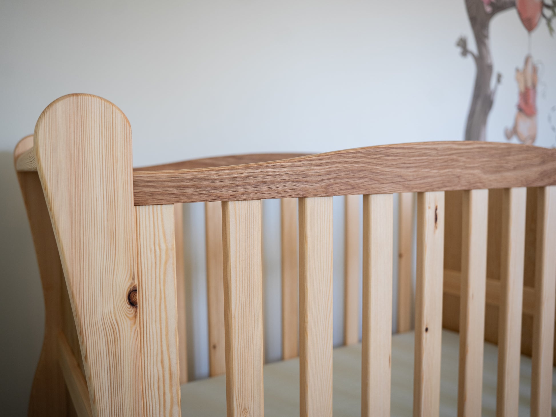 - Scandinavian softwood cot with oak handrails to withstand teething infants.